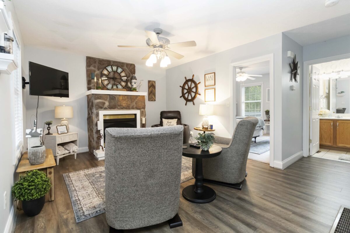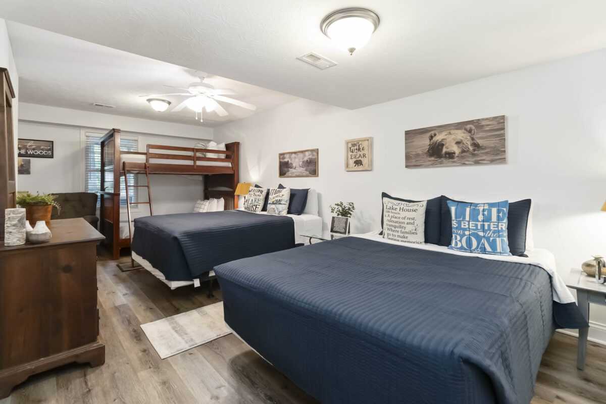 The Forest Lakehouse features two inviting bedrooms on the main floor, with a spacious open basement that doubles as an additional sleeping area and family entertainment space—ideal for larger groups. Guests can unwind by the cozy indoor fireplace or enjoy the fresh air and peaceful surroundings from the upper and lower decks. This pet-friendly cabin welcomes small dogs under 20 lbs. with a refundable pet deposit, so the whole family can join the fun!